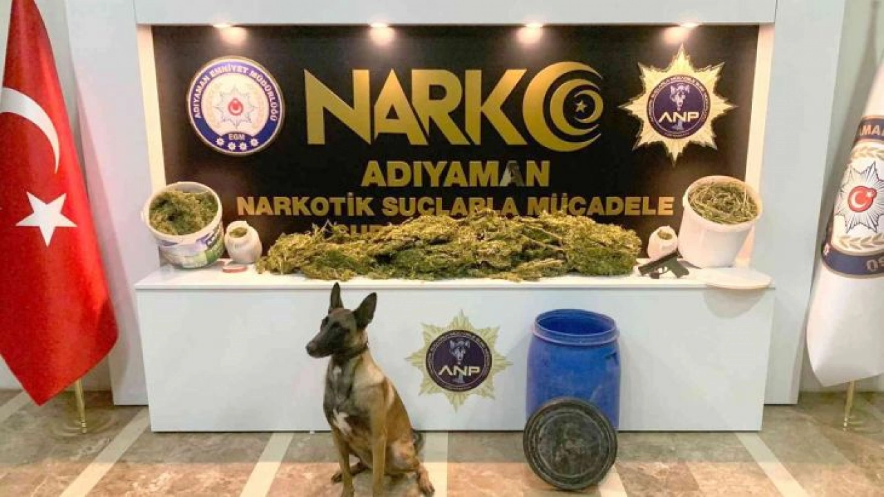 Adıyaman Narkotik Suçlarla Mücadele Şube Müdürlüğü ekiplerince yapılan operasyonda adresinde narkotik köpeği 'Kendal'ın aramalarıyla 8 kilo 900 gram esrar ile yakalanan şahıs gözaltına alındı.