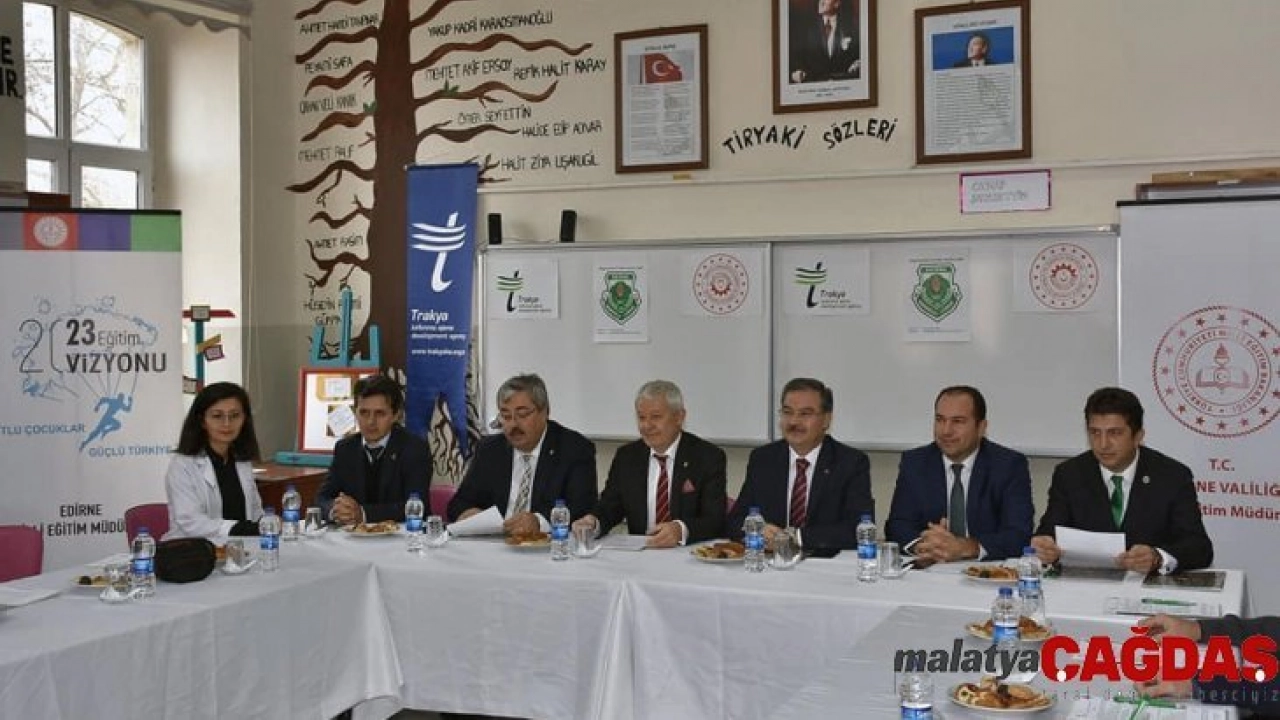Edirne Mesleki ve Teknik Anadolu Lisesinde düzenlenen proje tanıtım toplantısına İl Millî Eğitim Müdürü Dr. Önder Arpacı, Edirne Ticaret Sanayi Odası Yönetim Kurulu Başkanı Recep Zıpkınkurt ile sorumlu yöneticiler katıldı.