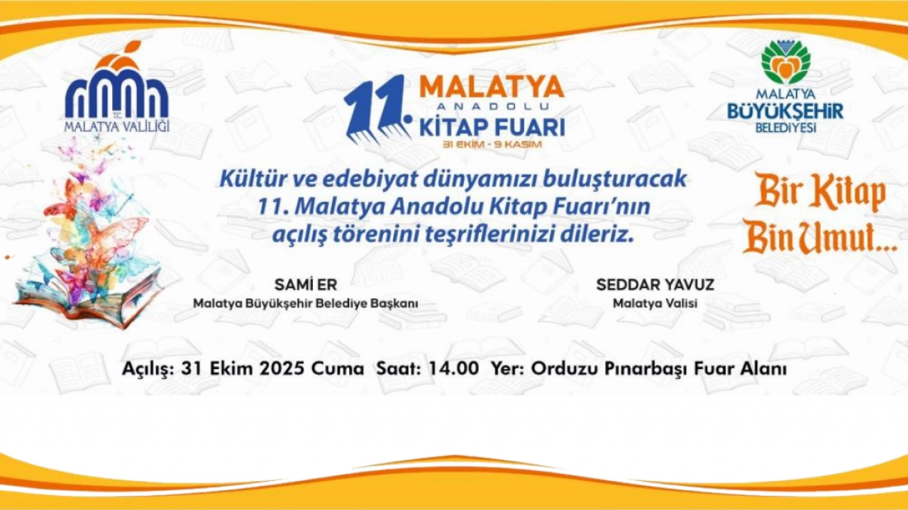 Bu yıl 11.'si düzenlenen Malatya Anadolu Kitap ve Kültür Fuarı 31 Ekim-9 Kasım tarihleri arasında kitapseverlere kapılarını açıyor. 'Bir Kitap Bin Umut' temasıyla gerçekleştirilecek olan kitap fuarına 320 yayınevi ve 340 yazar katılım sağlayacak.