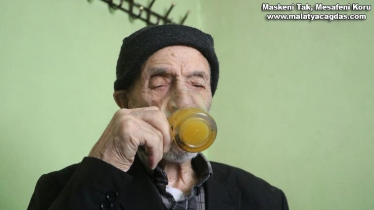 Malatya'da Covid-19 hastalığına yakalanmayan 110 yaşındaki Mahmut Kaya, doğal beslenip bol bol kola içerek yaşamını sürdürüyor.