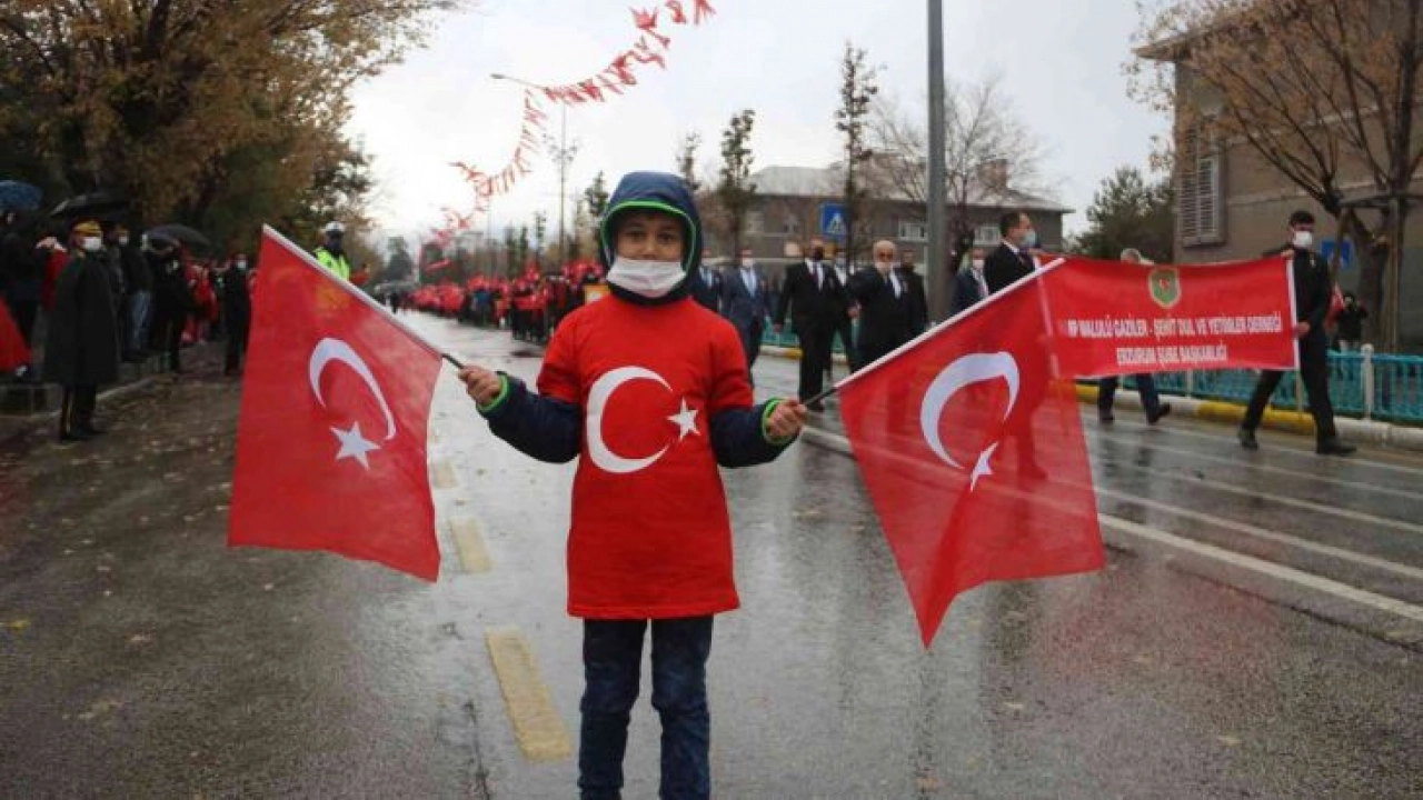 Erzurum'da Cumhuriyetin Kuruluşunun 98. yılı düzenlenen törenle kutlandı. Kutlamalar sırasında başlayan yağmur ise kutlamalara engel olmadı. Şemsiyelerini ve yağmurluklarını alan 7'den 70'e yüzlerce Erzurumlu, tören alanına koştu.