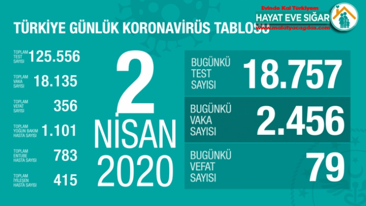 Sağlık Bakanlığından yapılan açıklamada, korona virüs nedeniyle son 24 saatte 79 kişinin hayatını kaybettiği toplam vefat sayısının 356 olduğu açıklandı. Açıklamada, bugünkü test sayısının 18 bin 757 ve vaka sayısının 2 bin 456 olduğu belirtildi. Toplam test sayısının 125 bin 556, toplam vaka sayısının 18 bin 135, yoğun bakım hasta sayısının bin 101, entübe hasta sayısının 783, iyileşen hasta sayısının 415 olduğu kaydedildi.