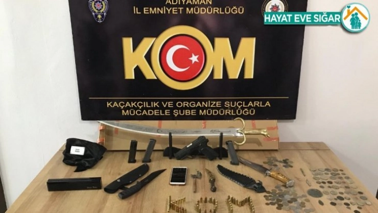 Yapılan aramalarda toplam 4 Tabanca, 7 şarjör, 124 fişek, 1 “Polis” ibareli Basın Kartı, 1 telsiz, 2 mühürlü poşet içerisinde boş kovan, 1 kelepçe, 2 bıçak, 2 kasatura, 1 kılıç, tarihi eser nitelikli 2 bıçak ve 100 sikke ele geçirildi. Ayrıca suç unsuru içerebileceği değerlendirilen çok sayıda dijital materyal da ele geçirildi.