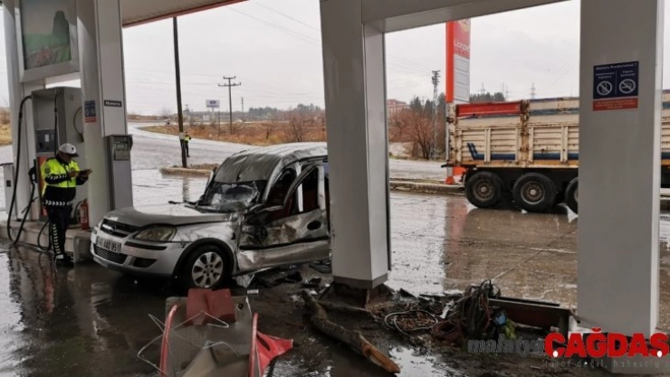 Adıyaman'da, sürücüsünün direksiyon hakimiyetini kaybettiği hafif ticari araç, yol kenarında bulunan akaryakıt istasyonuna dalarak yakıt pompasını yerinden fırlattı. Facianın eşiğinden dönülen kazada 3 kişi yaralandı.