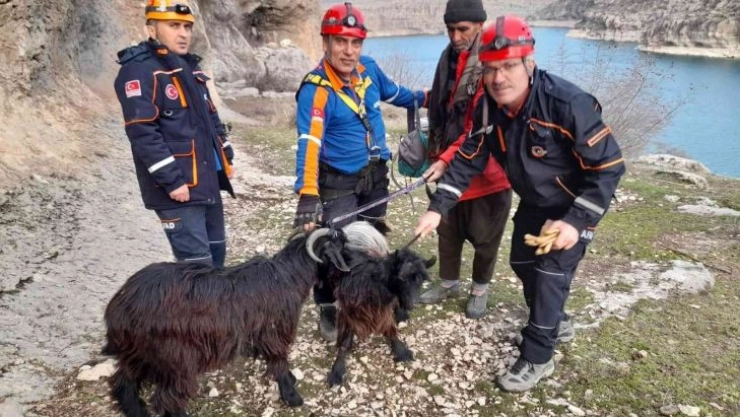 Adıyaman'ın Gerger ilçesinde kayalıkta mahsur kalan 2 keçi AFAD ekipleri tarafından kurtarıldı.