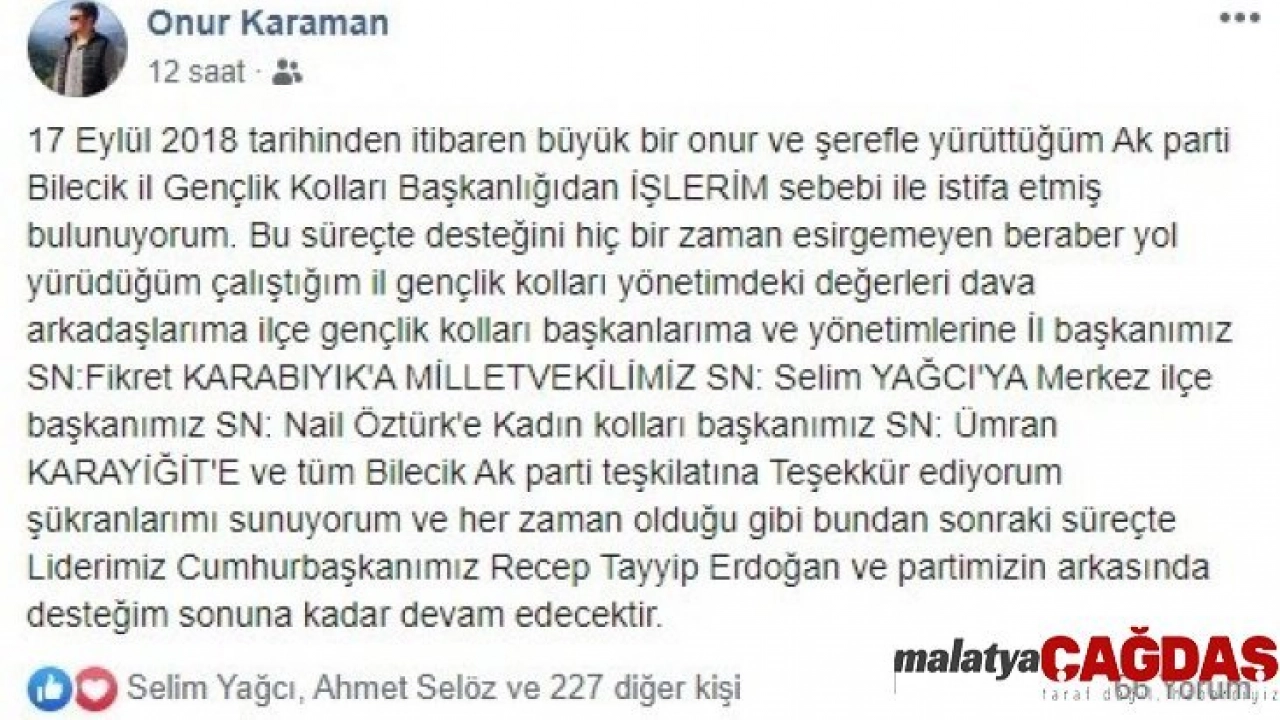 AK Parti Bilecik Gençlik Kolları Başkanı Onur Karaman, görevinden istifa ettiğini duyurdu.