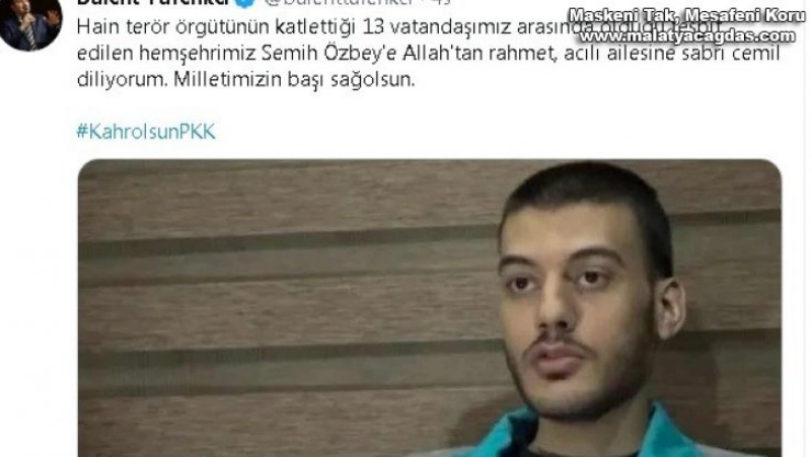 AK Parti MKYK Üyesi ve Malatya Milletvekili, 64. ve 65. Hükümet Gümrük ve Ticaret Bakanı Bülent Tüfenkci, 13 sivil vatandaşı alçakça katleden kanlı terör örgütünü ve örgüte destek olanları lanetleyerek, "Masum insanların kafalarına kurşun sıkan hainleri kim aklamaya ve arkalamaya yelteniyorsa bilinsin ki onlar da bu suça ortaktır" dedi.