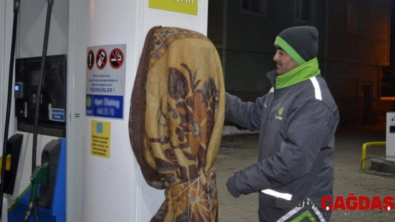 Akaryakıt istasyonunda pompalara battaniyeli koruma