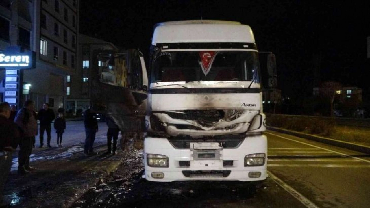 Alev topuna dönen çekiciyi itfaiye söndürdü