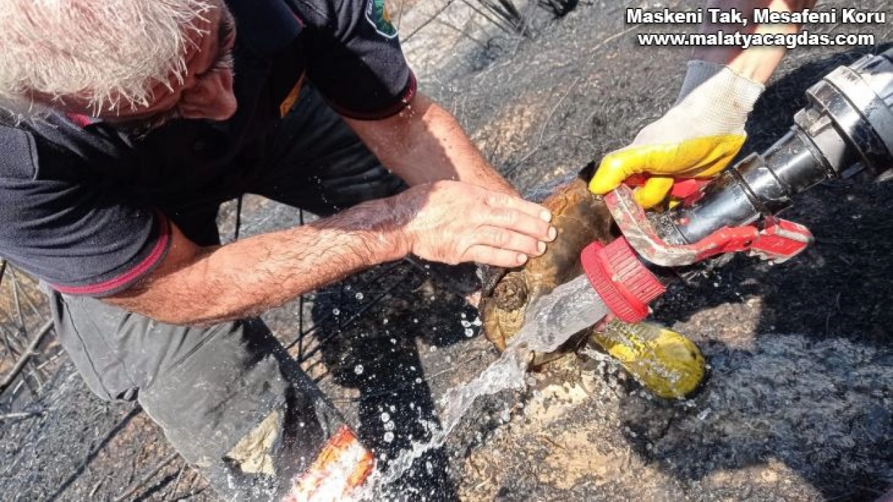 Malatya'da çıkan örtü yangınında alevlerin arasında kalan kaplumbağayı itfaiye kurtardı.