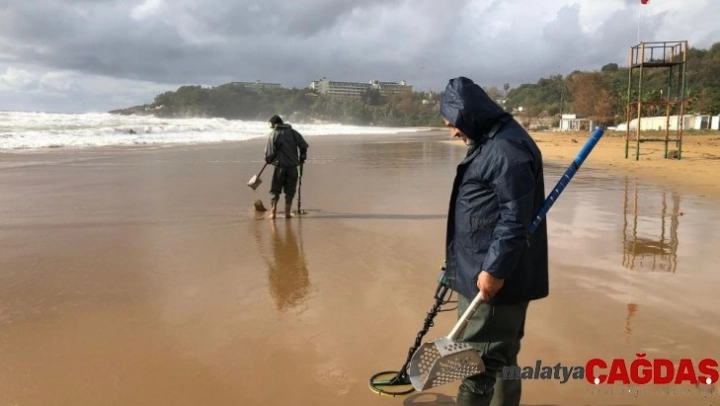 Antalya'da son iki gündür etkisini gösteren fırtınada denizde de büyük dalgalar oluştu. Havanın normale dönmesiyle beraber değerli eşya arayanlar sahilleri taramaya başladı. Antalya'nın Alanya ilçesinde bulunan İncekum plajında da iki kişi ellerindeki dedektörlerle değerli eşya aradı. Sahili boydan boya didik didik tarayan defineciler umutla bir şeyler bulmayı denedi.
