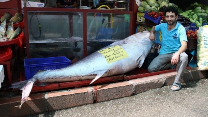 İzmir'de balıkçılar tarafından avlanan dev orkinos balığı, Elazığ'da bir balıkçı dükkanı önünde sergilendi. 2 metre 36 santimetre uzunluğunda ve 241 kilogram ağırlığındaki balığı görenler hayrete düştü. Dev orkinos yoldan geçenlerin ilgi odağı oldu. Dev balığı görmek için sıraya giren vatandaşlar, orkinosu şaşkınlıkla izleyerek fotoğrafını çekti. Orkinosun kilosunun 30 liradan satışa çıkarılacağı belirtildi.