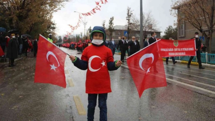 Tören sırasında aniden bastıran yağmur ise vatandaşlara engel olmadı. Şemsiyesini ve yağmurluğunu giyinen vatandaşlar tören alanına koştu. Bebek arabasında alana çocuklarını getiren aileler ise töreni yağmura rağmen ellerindeki bayraklarla takip ettiler.