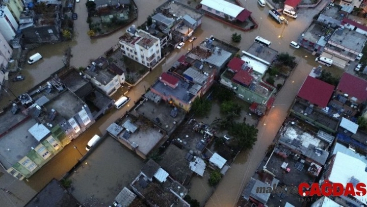 Adana'da dün geceden bu yana süren sağanak nedeniyle birçok araç yolda kaldı. Adeta Venedik'e dönen kent drone ile havadan görüntülendi.