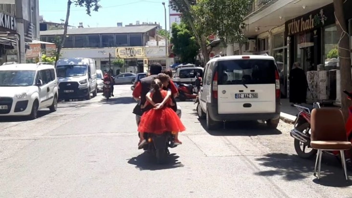 Adıyaman merkez Cumhuriyet Caddesi üzerinde ilerleyen elektrikli bisikletin üzerindeki manzarayı görenler gözlerine inanamadı. Sürücünün dışında diğerlerinin 7 ila 12 yaş arasında olduğu tahmin edilen çocuklar birbirlerine sımsıkı sarılarak yolculuk yaptı. Bu tehlikeli yolculukta sürücü, çocuklardan 2'sini önüne, 2'sini arkasına alarak ilerledi.