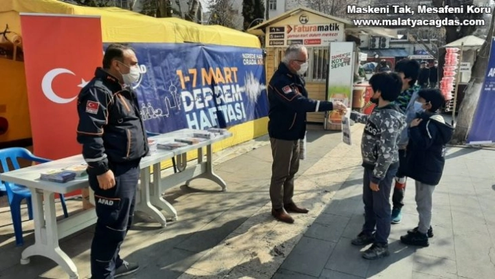 2021 yılının Afet Eğitim Yılı olarak kabul edilmesi nedeniyle vatandaşları afetlere karşı hazırlıklı olunması uyarısında bulunan görevliler deprem, sel, heyelan gibi afet durumları ile ilgili bilgi verdi.