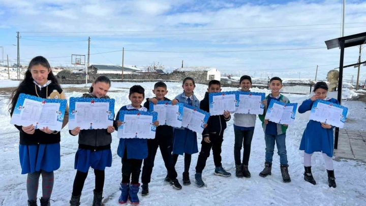 Kars'ın Akyaka ilçesine bağlı Kürekdere İlkokulu'nda yoğun geçen yarıyılın sonunda öğrenciler karnelerini öğretmenlerinin elinden aldı. Onur ve takdirname belgeleriyle karnelerini alan öğrencilerin sevinçleri yüzlerine yansıdı.
