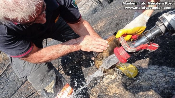Malatya'da çıkan örtü yangınında alevlerin arasında kalan kaplumbağayı itfaiye kurtardı.