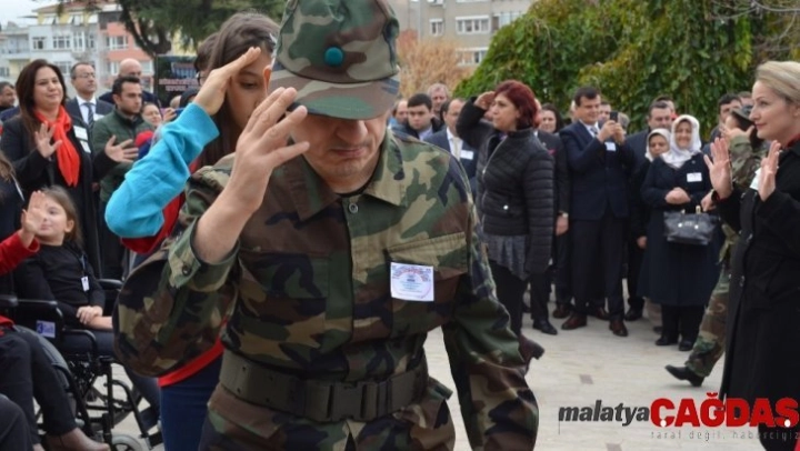 Programın devamında ise askeri üniforması giydirilen engelliler, 'Vatan Marşı' eşliğinde çeşitli gösteriler yaptı ve asker selamı verdi. Askeri üniformalı engellilerin gösterileri katılımcılar tarafından büyük bir alkış topladı.
