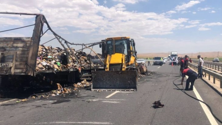 Şanlıurfa'da seyir halindeki atık malzeme yüklü tır yanarak küle döndü.
