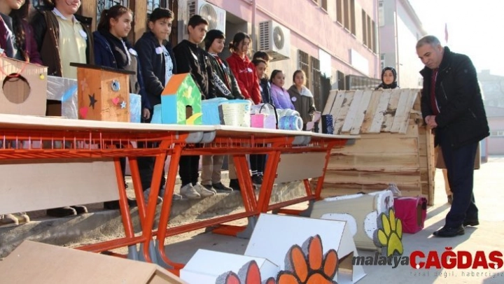 Manisa'nın Kula ilçesinde eğitim-öğretim veren Jeopark Ortaokulunun öğrencileri, çevre kirliliğine dikkat çekmek ve vatandaşlara hayvan sevgisini aşılamak amacıyla topladıkları atık malzemelerden sokak hayvanları için kulübeler yaptı.