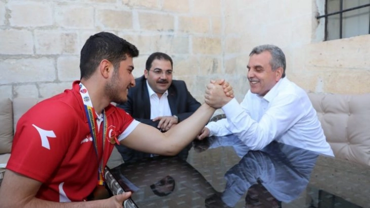 Her zaman gençliğin ve sporcunun yanında olduklarını ifade eden Haliliye Belediye Başkanı Mehmet Canpolat, 'Birlik ve beraberlik içerisinde önce inanacağız sonra da başaracağız' dedi. Başkan Mehmet Canpolat, '26 ülkenin katıldığı, Romanya'da düzenlenen Avrupa Şampiyonası'nda bilek güreşi şampiyonu olarak geldi. İşte Osmanlı torunu, Osmanlı ocağında yetişmiş bir kardeşimiz, inşallah hep birlikte böyle birlik ve beraberlik halinde biz Türkiye Cumhuriyeti'nde yaşayan kardeşler olarak hep birlikte inandık mı başaramayacağımız herhangi bir şey yoktur. Abdulsamet Ocakoğlu kardeşimi, ailesini tebrik ediyorum. Kendisi de inşallah güzel öğrenciler yetiştirecek ve hepbirlikte Şanlıurfa'mızın adını daha yükseklerde, bayrağımızı daha yükseklerde dalgalandırmaya devam edeceğiz' şeklinde konuştu.