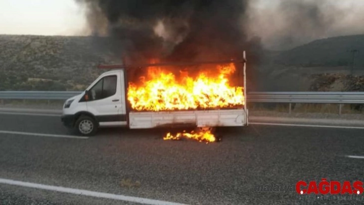 Adıyaman'da Besni-Gaziantep yolu üzerinde seyir halinde olan ayakkabı yüklü kamyonet alev alev yandı.