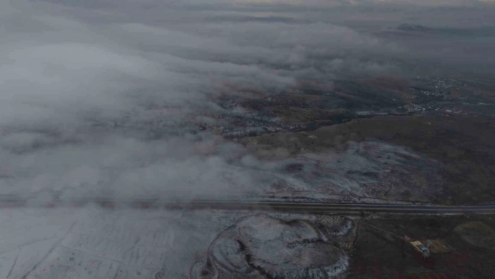 Elazığ'da etkili olmaya başlayan soğuk hava, yüksek kesimlerde kendini kar yağışıyla gösterdi. 4 bin yıllık tarihiyle kentin simgelerinden biri olan Harput Mahallesi'nde dün akşam saatlerinde kar yağışı başladı. Yağış henüz bölgeyi tamamen beyaza bürümese de yer yer oluşan beyazlıklar kışın habercisi oldu. Sabah saatlerinde dron ile havadan görüntülenen Harput Mahallesi ve merkeze bağlı Nuralı Köyü ise ortaya sıra dışı manzaralar çıkardı. Aynı rakımda bulunmasına rağmen bazı bölgelerin karla kaplandığı, bazı alanlarda ise karın hiç tutmadığı görüldü. Dron görüntülerinde, birkaç yüz metre arayla kar, sis ve karsız alanların aynı karede buluşması dikkat çekti.
