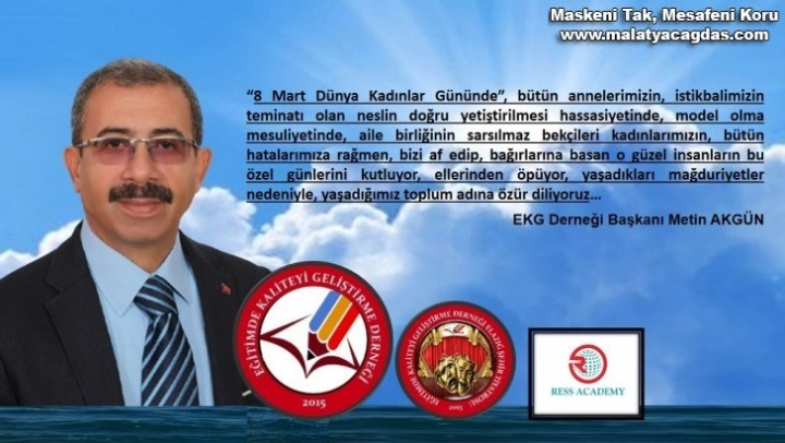 Bu vesile ile şahsım ve Eğitimde Kaliteyi Geliştirme Derneği adına, “8 Mart Dünya Kadınlar Gününde”, bütün annelerimizin, istikbalimizin teminatı olan neslin doğru yetiştirilmesi hassasiyetinde, model olma mesuliyetinde, aile birliğinin sarsılmaz bekçileri kadınlarımızın, bütün hatalarımıza rağmen, bizi af edip, bağırlarına basan o güzel insanların bu özel günlerini kutluyor, ellerinden öpüyor, yaşadıkları mağduriyetler nedeniyle, yaşadığımız toplum adına özür diliyoruz…