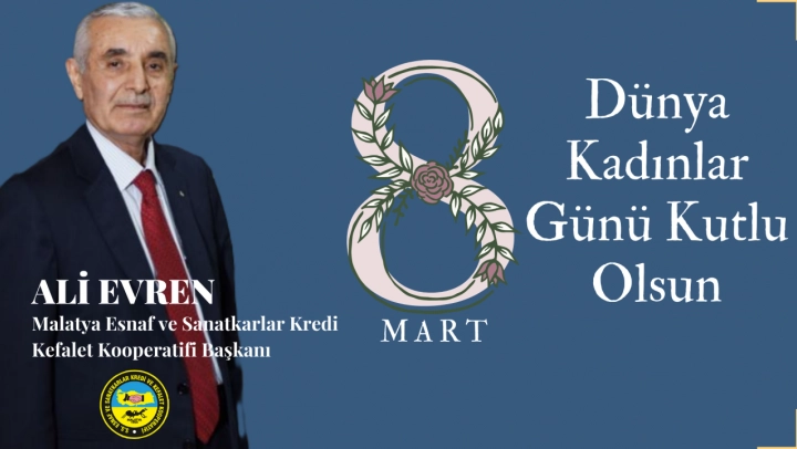 Esnaf ve Sanatkrlar Kredi Kefalet Kooperatifi Başkanı Ali Evren, 8 Mart Dünya Kadınlar Günü dolayısıyla yayımladığı mesajında, kadınların toplumsal ve ekonomik hayattaki önemine vurgu yaptı. Evren, kadınların her alanda daha güçlü olması için destek olunması gerektiğini belirterek, kadın esnaf ve girişimcilere başarılar diledi.