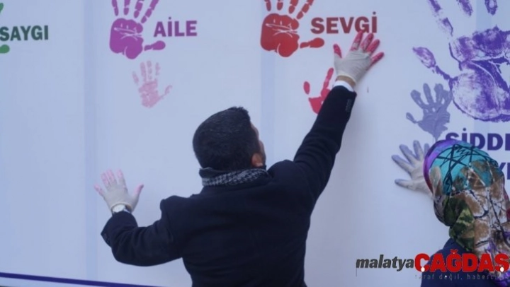 Daha sonra Belediye Başkanı Rasim Arı, eşi Melek Arı, AK Parti Kadın Kolları Başkanı Ayşe Bilgiç ve etkinliğe katılan kadınlar hep birlikte 'Kadına Şiddete Sende Dur De!' yazılı brandaya farkındalık oluşturmak için boya ile el bastılar.
