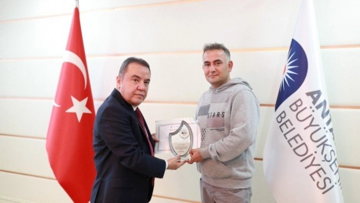 Antalya Büyükşehir Belediye Başkanı Muhittin Böcek Elazığ depreminin ardından yaraları sarmak üzere bölgeye giden mobil aşevi ve sosyal hizmetler ekibine teşekkür plaketi verdi.