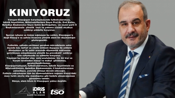 Elazığ Ticaret ve Sanayi Odası (ETSO) Başkanı İdris Alan, Artı Değer Vanspor FK-Çimtaş Elazığspor müsabakası sonrası Elazığ kafilesine yönelik gerçekleştirilen saldırıya ilişkin sert bir kınama mesajı yayımladı.