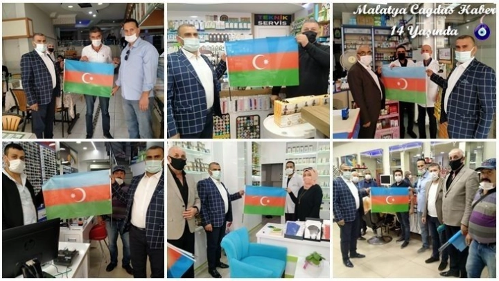 MHP Battalgazi İlçe Başkanı İlhan İlhan destek amacıyla iş yerlerine asılmak üzere Azerbaycan bayrağı dağıttı.