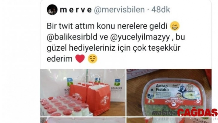 Mervisbilen isimli Twitter kullanıcısı kendi hesabından Başkan Yücel Yılmaz'ı ve Balıkesir Büyükşehir Belediyesi'ni etiketleyerek tatlı istedi. Final haftası öncesi öğrencinin bu arzusu Başkan Yücel'in talimatı ile Büyükşehir ekipleri tarafından hemen yerine getirildi. Üniversiteli genç kız ile irtibata geçen ekipler, süt, tatlı ve ayran dolu paketi verilen adrese gönderdi. Büyük mutluluk duyan genç kız, yine sosyal medya hesabından, 'Güzel hediyeleriniz için Başkan Yücel Yılmaz'a ve Büyükşehir Belediyesi'ne teşekkür ediyorum' notunu paylaştı.