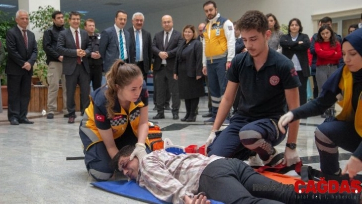 Bilecik Şeyh Edebali Üniversitesi Sağlık Hizmetleri Meslek Yüksekokulu'nda düzenlenen Paramedikler Günü etkinliklerinde senaryo gereği yaralı bir şahsa paramediklerin müdahalesi gerçeği aratmadı.