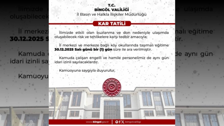 Bingöl Valiliği'nden yapılan açıklamada, 'İlimizde etkili olan buzlanma ve don nedeniyle ulaşımda oluşabilecek risk ve tehlikelere karşı tedbir amacıyla; il merkezi ve merkeze bağlı köy okullarında taşımalı eğitime 30.12.2025 Salı günü bir (1) gün süre ile ara verilmiştir. Kamuda çalışan engelli ve hamile personelimiz de aynı gün idari izinli sayılacaklardır' denildi.