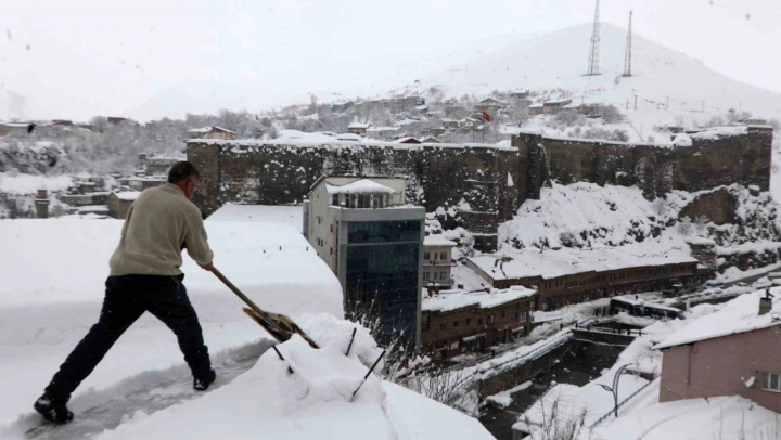 Bitlis'te etkili olan yoğun kar yağışı sonrası kent genelinde vatandaşlar çatılarda kar küreme mesaisine başladı.