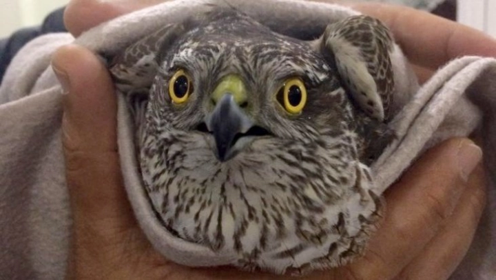 Adıyaman'da evin camına çarpan ve yaralanan yavru atmaca, battaniyeye sarılarak evde ısıtıldı.