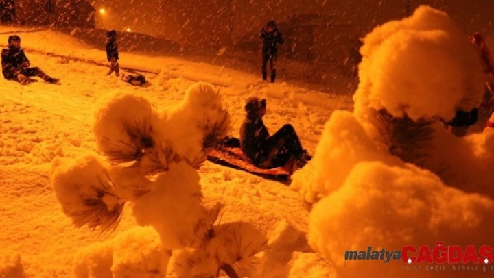 Van'da etkili olan kar yağışının ardından kızak ve poşetlerle gece karanlığında kayan çocuklar doyasıya eğlendi.