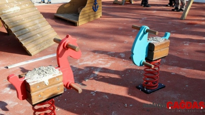 Bursa'nın Mudanya ilçesinde çocuk parkında bulunan eğlence aletlerine beton dökülerek zarar verildi.
