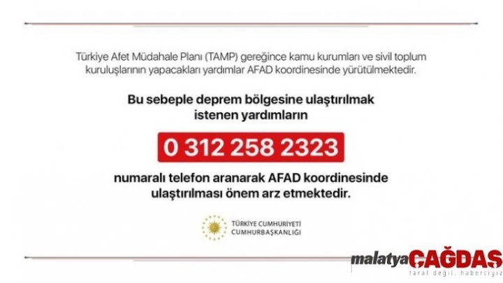 Cumhurbaşkanlığı, resmi Twitter hesabından yaptığı açıklamada, Türkiye Afet Müdahale Planı (TAMP) gereğince kamu kurumları ve sivil yardım kuruluşlarının yapacakları yardımlar AFAD koordinesinde yürütülmektedir. Bu sebeple deprem bölgesine ulaştırılmak istenen yardımların '0 312 258 23 23' numaralı telefon aranarak AFAD koordinesinde ulaştırılması önem arz etmektedir" ifadeleri kullanıldı.