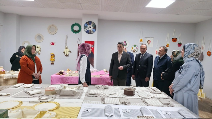 Kaymakam Gülyer ve beraberindekiler, kursiyerler tarafından hazırlanan el emeği ürünlerin yer aldığı sergiyi gezerek yapılan çalışmalar hakkında bilgi aldı.