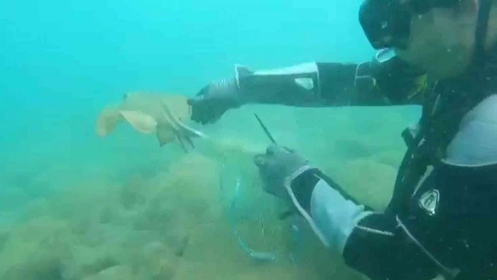 Hatay'ın İskenderun ilçesinde yapılan deniz dibi ve kıyı temizliği çalışmasında ağlara takılan vatoz balığı, Sahil Güvenlik Doğu Akdeniz Grup Komutanlığı dalış ekipleri tarafından kurtarıldı.