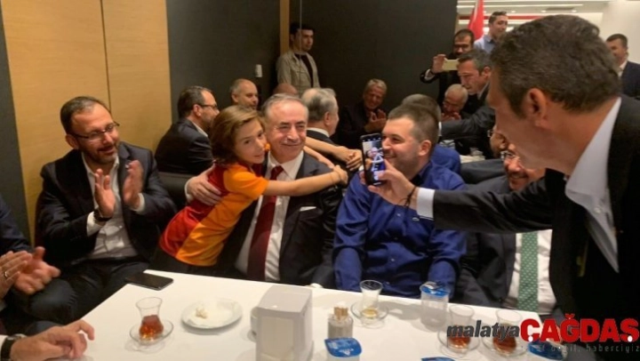 Bu esnada sarı-kırmızılı minik taraftar Galatasaray Başkanı Cengiz ile fotoğraf çektirmek istedi. Minik taraftarın fotoğrafının ise Fenerbahçe Başkanı Ali Koç çekti.