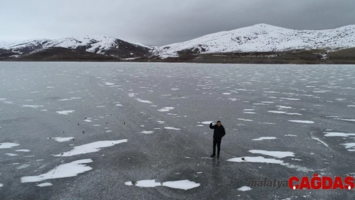 Sivas'ta vatandaşlar, yüzeyi buzla kaplanan göletin üzerinde yürümenin keyfini çıkardı.