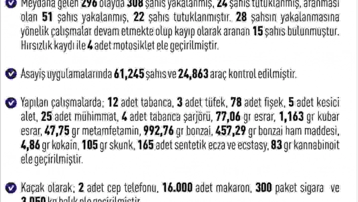 Yapılan çalışmalarda; 12 adet tabanca, 3 adet tüfek, 78 adet fişek, 5 adet kesici alet, 25 adet mühimmat, 4 adet tabanca şarjörü, 77,06 gram esrar, 1,163 gram kubar esrar, 47,75 gram metamfetamin, 992,76 gram bonzai, 457,29 gram bonzai ham maddesi, 4,86 gram kokain, 105 gram skunk, 165 adet sentetik ecza ve ecstasy, 83 gram kannabinoit, kaçak olarak; 2 adet cep telefonu, 16 bin adet makaron, 300 paket sigara ve 3.050 kilo balık ele geçirildiği bildirildi.