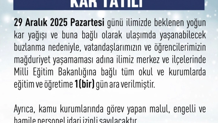 Elazığ Valiliği'nden yapılan açıklamada, '29 Aralık 2025 Pazartesi günü ilimizde beklenen yoğun kar yağışı ve buna bağlı olarak ulaşımda yaşanabilecek buzlanma nedeniyle, vatandaşlarımızın ve öğrencilerimizin mağduriyet yaşamaması adına ilimiz merkez ve ilçelerinde Milli Eğitim Bakanlığına bağlı tüm okul ve kurumlarda eğitim ve öğretime 1 gün ara verilmiştir. Ayrıca, kamu kurumlarında görev yapan malul, engelli ve hamile personel idari izinli sayılacaktır' denildi.