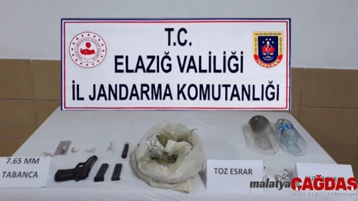 Elazığ'da jandarma ekiplerinin düzenlediği operasyonda 1 şüpheli gözaltına alındı, 1,5 kilogram toz esrarla birlikte çeşitli uyuşturucu maddeler ve 1 adet ruhsatsız tabanca ele geçirildi.
