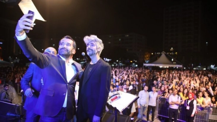 Sahnede öz çekim de yapan Başkan Şerifoğulları, ünlü sanatçıya kentin orcik, pestil, dut gibi yöresel ürünleri hediye etti.